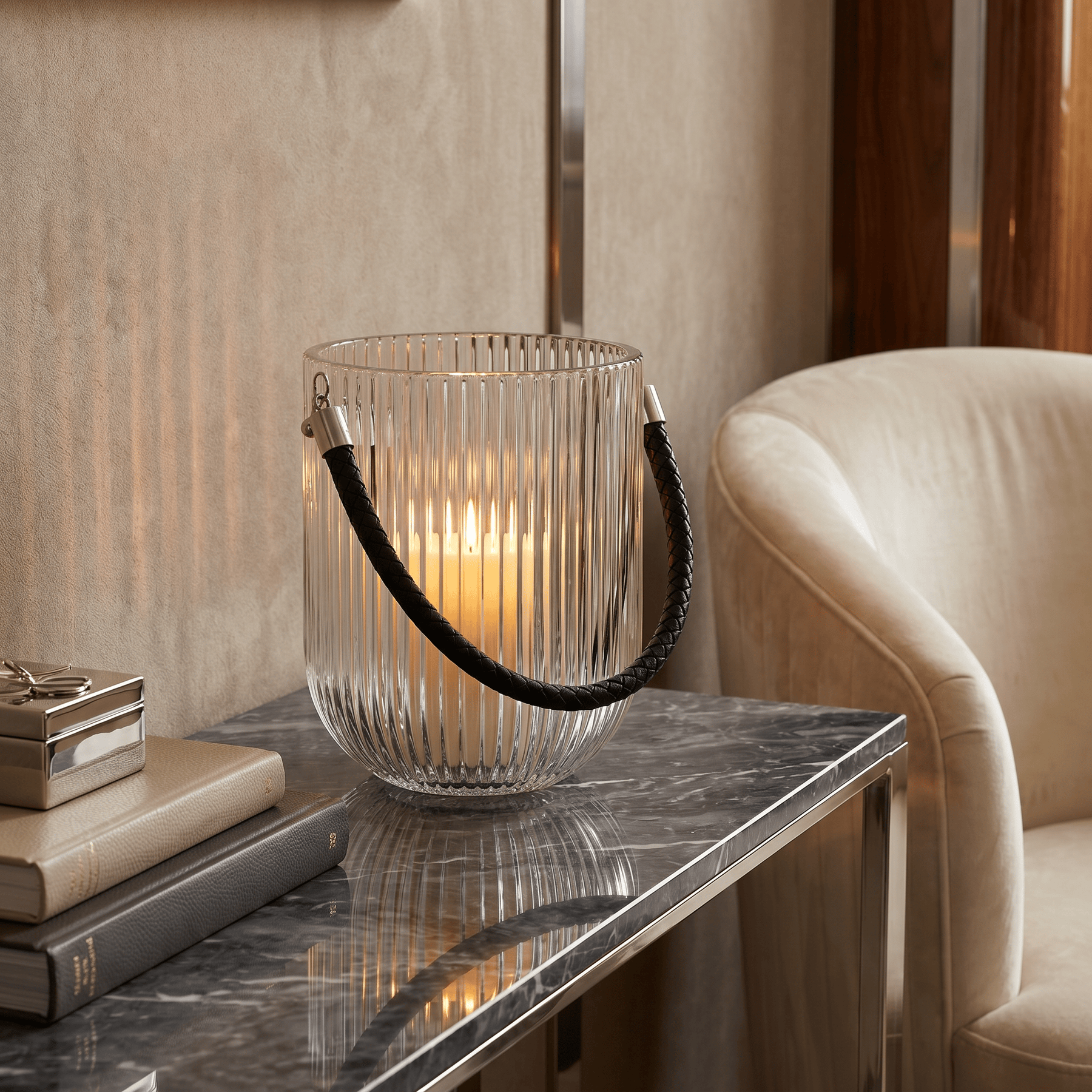 Mehr Volumen, mehr Wirkung. Diese größere Variante der Laterne Relax bringt das Spiel aus Licht und Struktur noch intensiver zur Geltung. Die klaren, vertikalen Linien im Glas lenken das Kerzenlicht sanft nach außen und erzeugen eine ruhige, elegante Ausstrahlung mit spürbarer Tiefe.