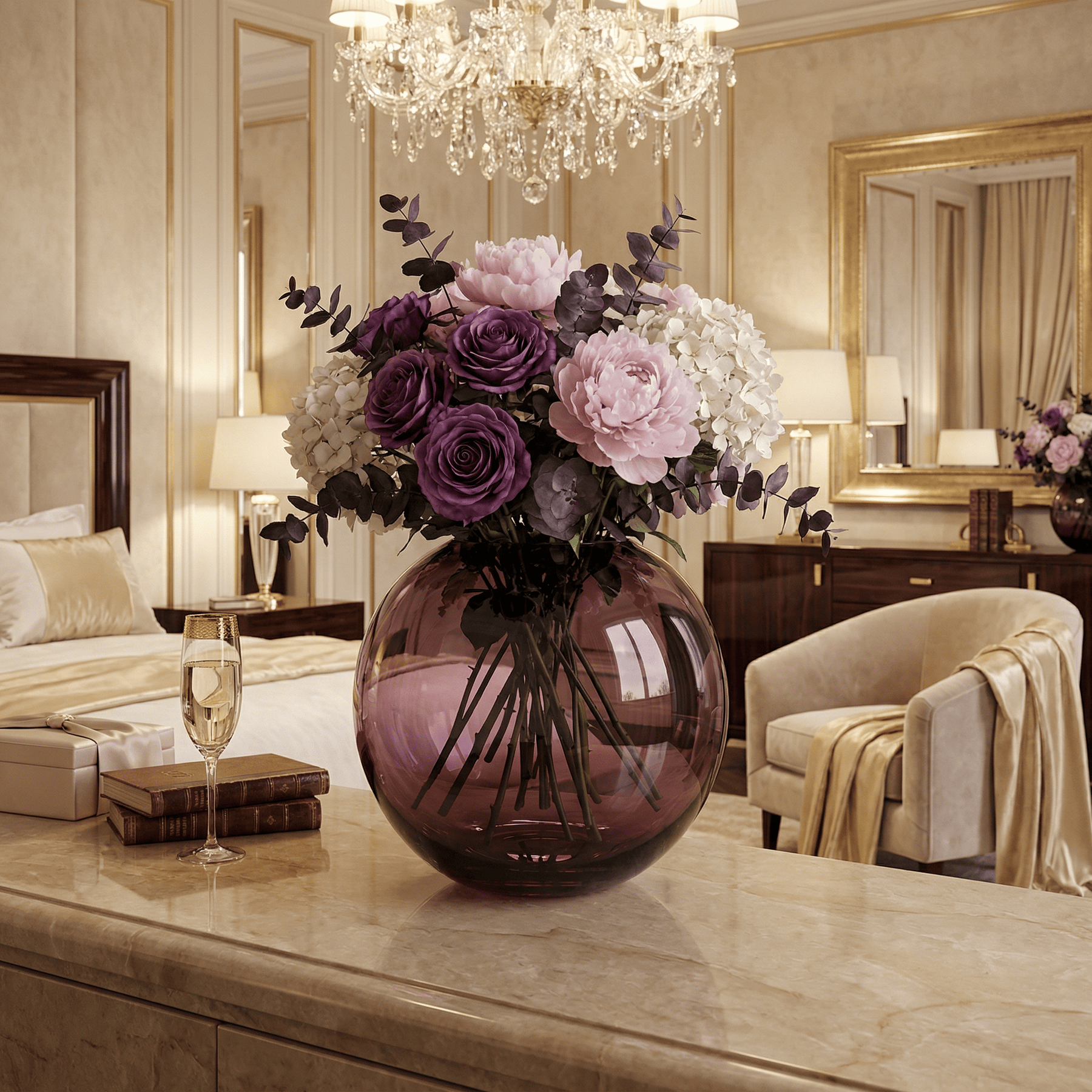 Verleihe deinem Zuhause mit der Kugelvase Opino Lila Ø 35 cm einen Hauch von Eleganz, Farbe und moderner Wohnkultur.