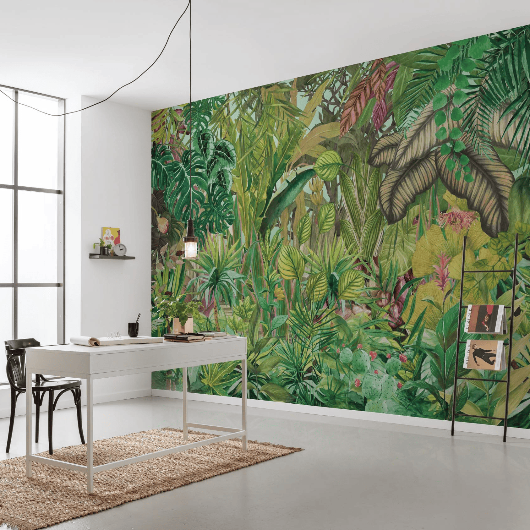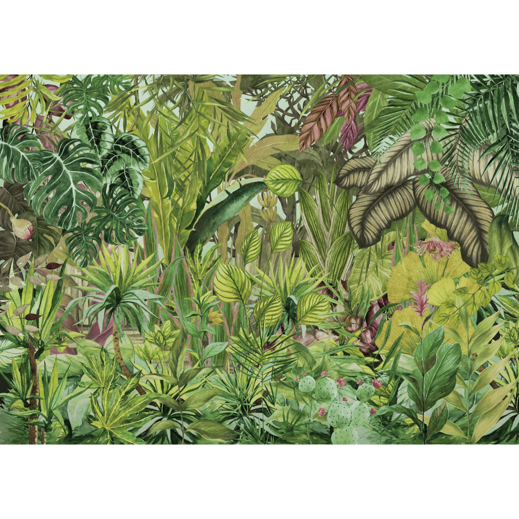 Das Tapetendesign bringt tropisches Flair Nachhause. Die leuchtenden Grüntöne und Akzente in Violett versprühen gute Laune und bringen den Dschungel Nachhause.