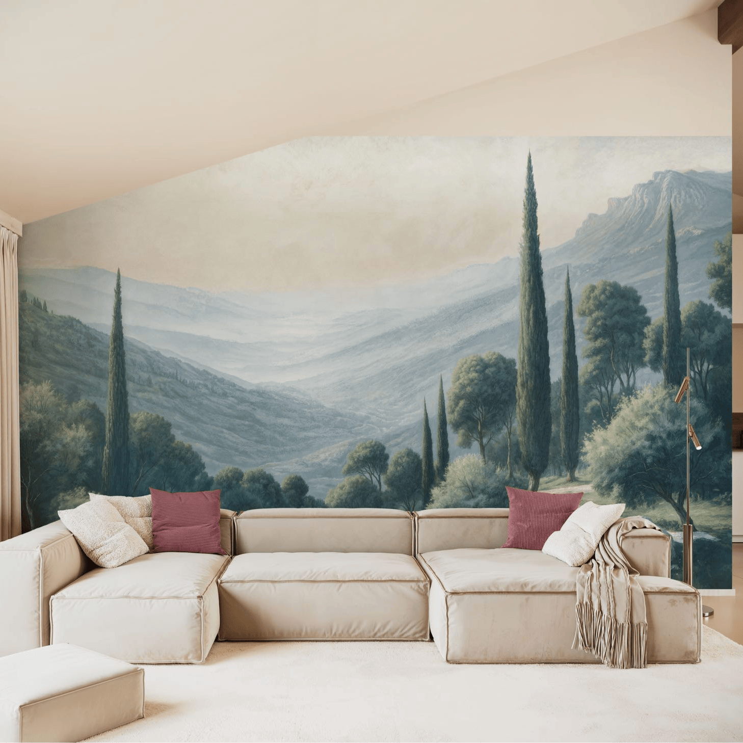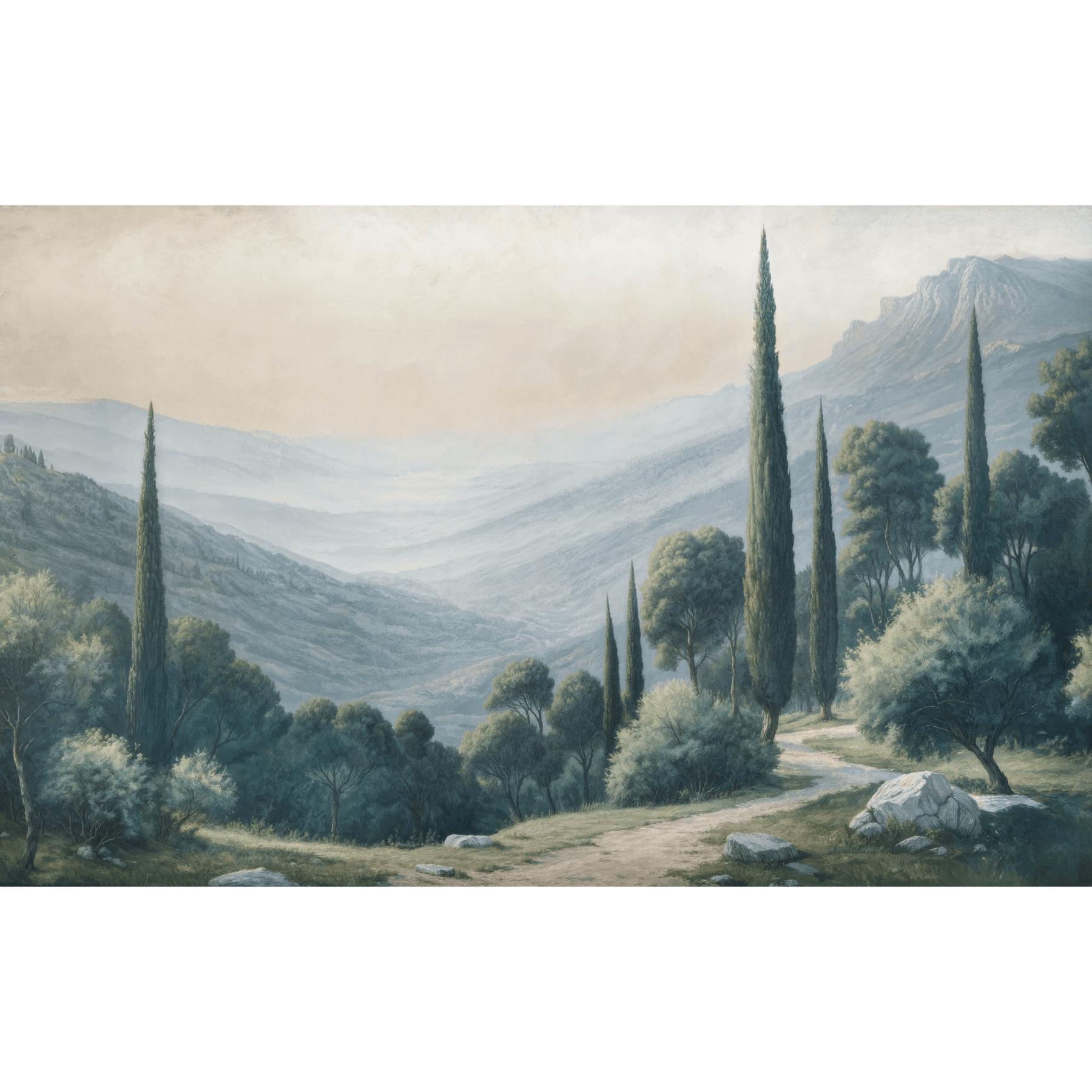 Dieses romantische Motiv lässt die Betrachter*innen von einem Urlaub in der Toskana träumen. Die mediterrane Berglandschaft in zarten Grüntönen wirkt endlos weit und verleiht jedem Raum Tiefe.