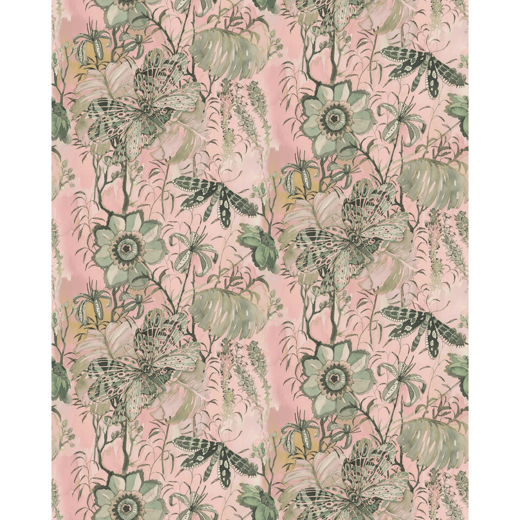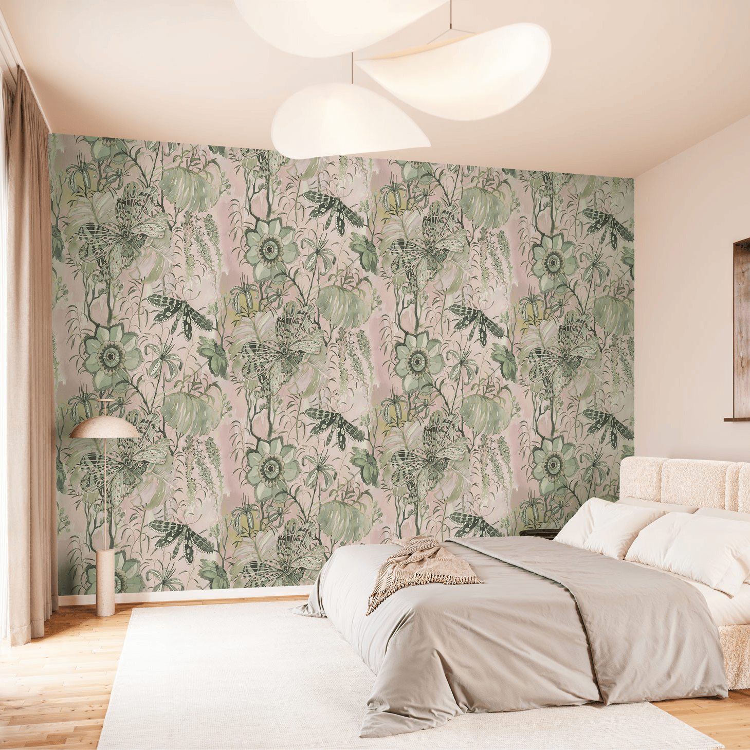 Das liebliche Motiv in Rosa-Grüntönen, schenkt Räumen eine freundliche Atmosphäre. Auf kunstvolle Art werden hier Blumen und zarte Falter in Szene gesetzt.