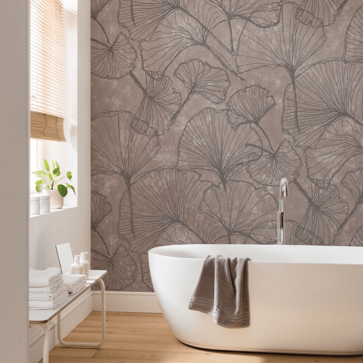 Die graue Steinoptik in Verbindung mit den Ginko Blättern ergeben ein modern-minimalistisches Design, dass sich durch die neutrale Farbgebung in Grau sowohl im Badezimmer als auch in Wohnräumen perfekt einfügt.