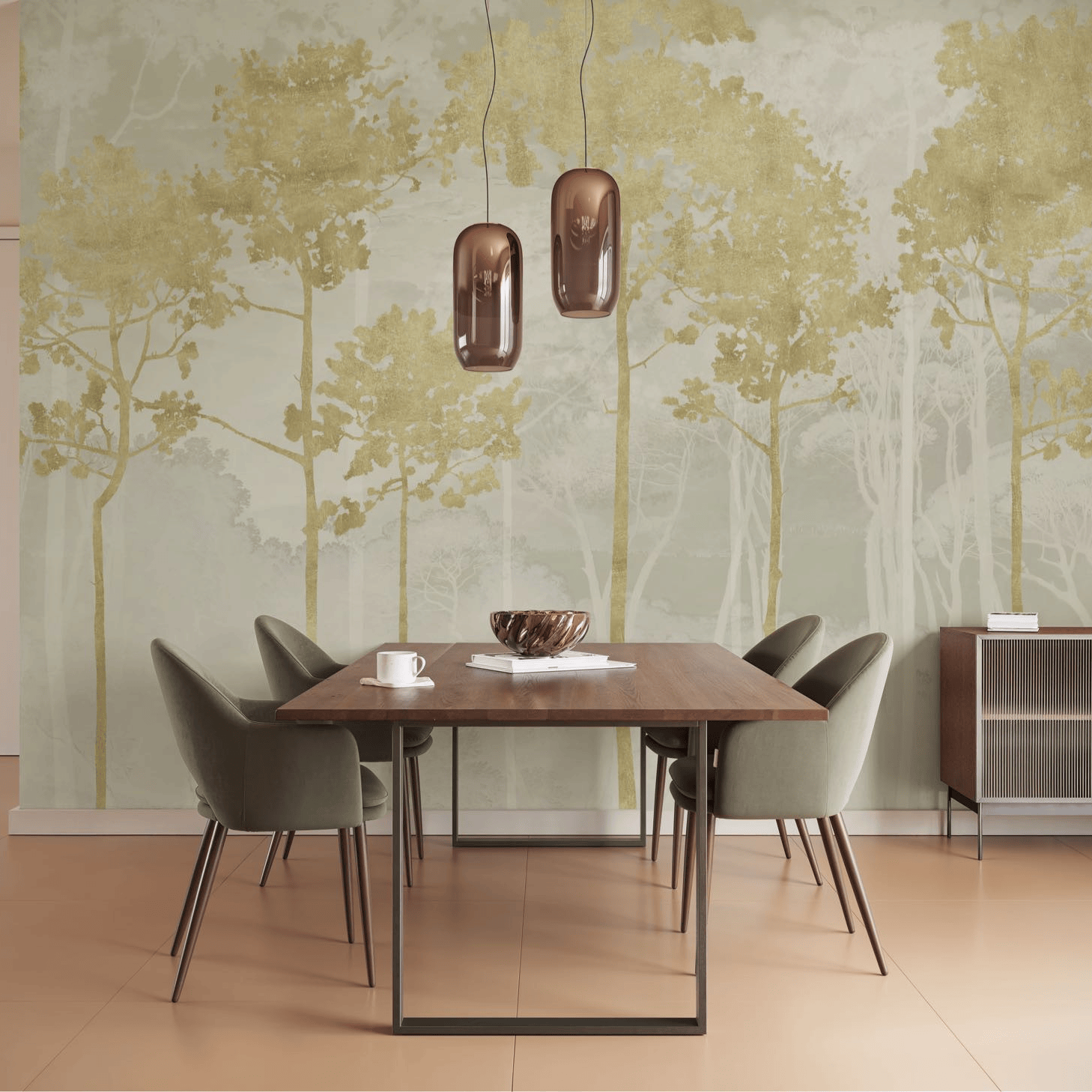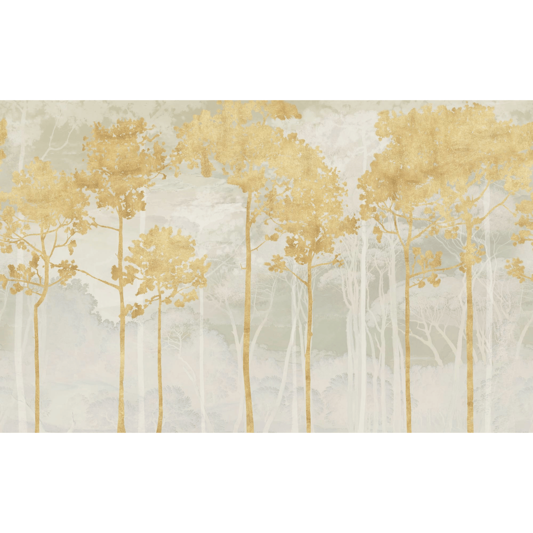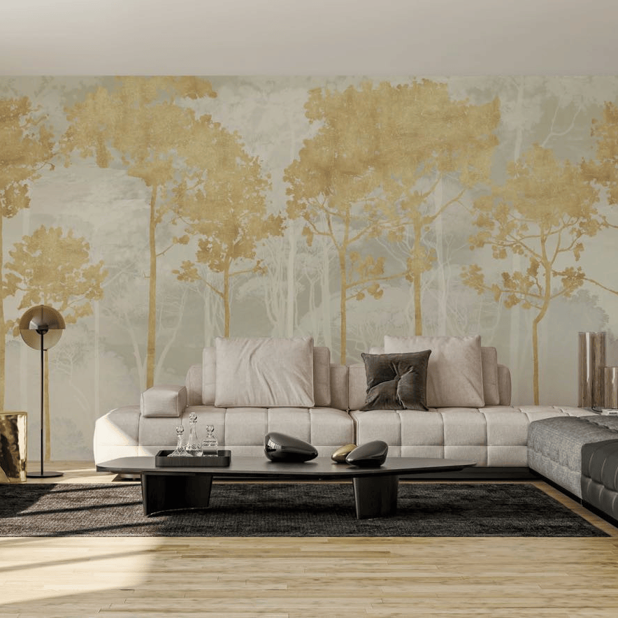Das Wanddesign in elegantem Grau-Gold versprüht einen Hauch Luxus im Raum. Die Pinienbäume wachsen hoch hinaus und lassen die Wand optisch höher aussehen.