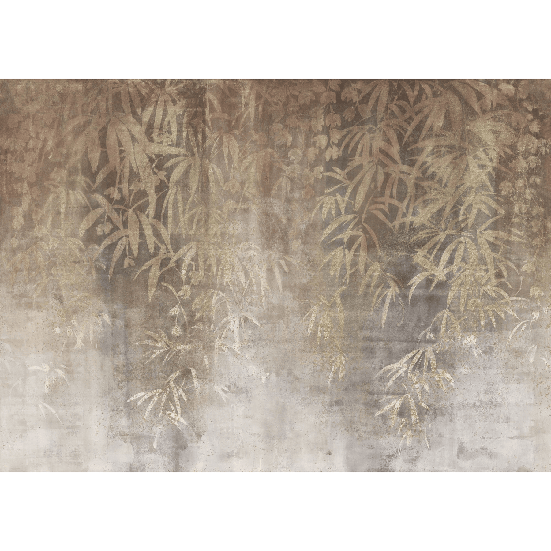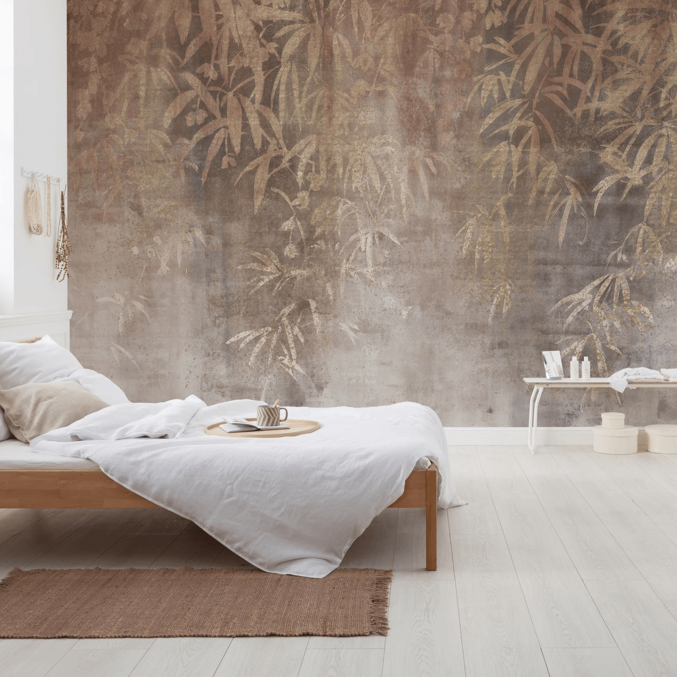 Die in Gold schimmernden Blätter fallen von der Decke herab. Das Wanddesgin ist in geschmackvollen Naturtönen gehalten und fügt sich dezent in den Raum ein. Ob auf einer kleinen oder großen Wand, werden die Betrachter*innen von der zurückhaltenden Designsprache beeindruckt sein.