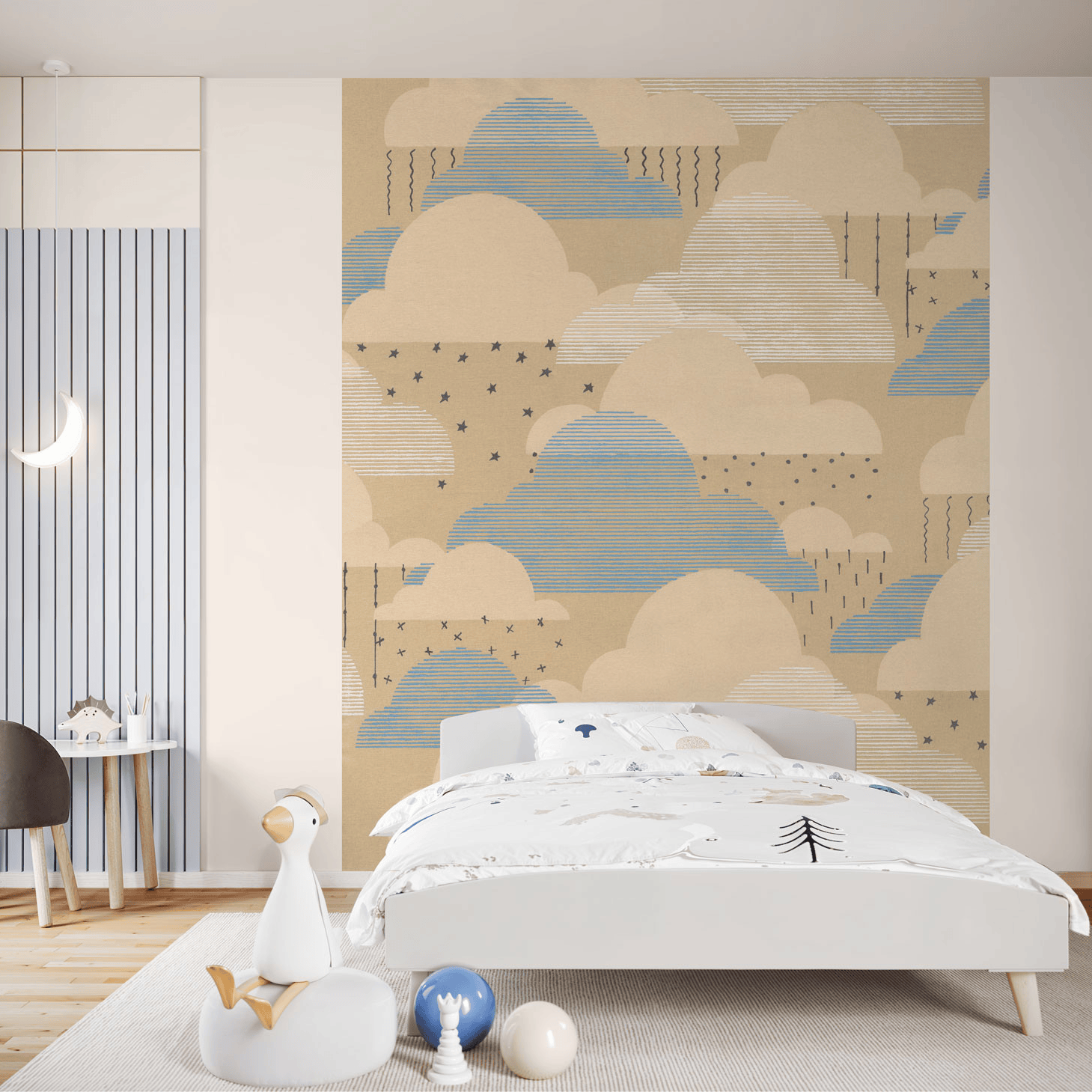 Die Wolkentapete lässt die kleinen Bewohner*innen behutsam ins Land der Träume einschlummern. Die hellen, zarten Farben fügen sich perfekt in kleine Welten ein.