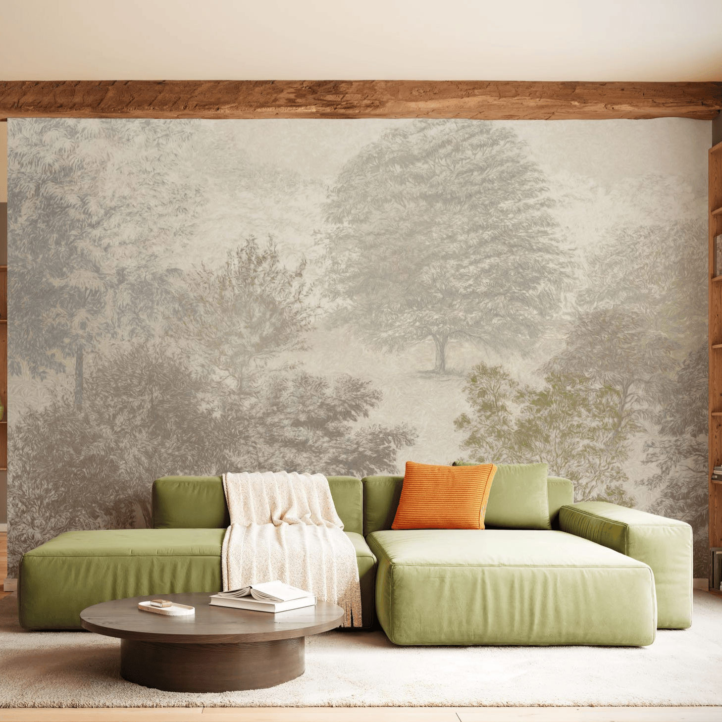 In zarten Tönen schmiegt sich dieses kunstvoll arrangierte Design an die Wand. Die Tapete versprüht Ruhe, wie man sie in braun-goldenen Herbstwäldern findet.