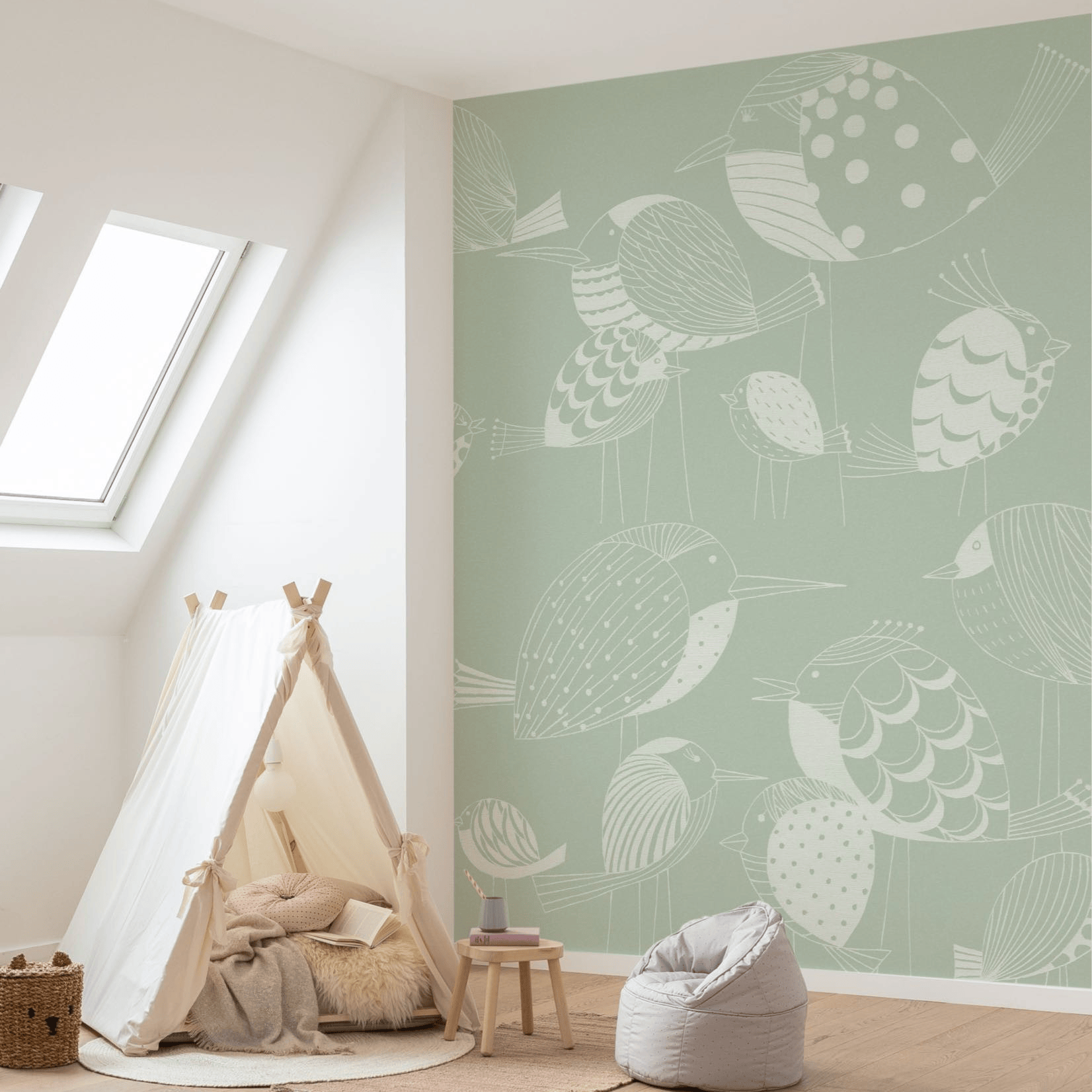 Das moderne Kindermotiv in hellem Mindgrün versprüht Fröhlichkeit im Zimmer kleiner Abenteuer. Die süßen Vögel in angesagter Line-Art Optik sind ein echter Hingucker, ohne dabei aufdringlich zu wirken.