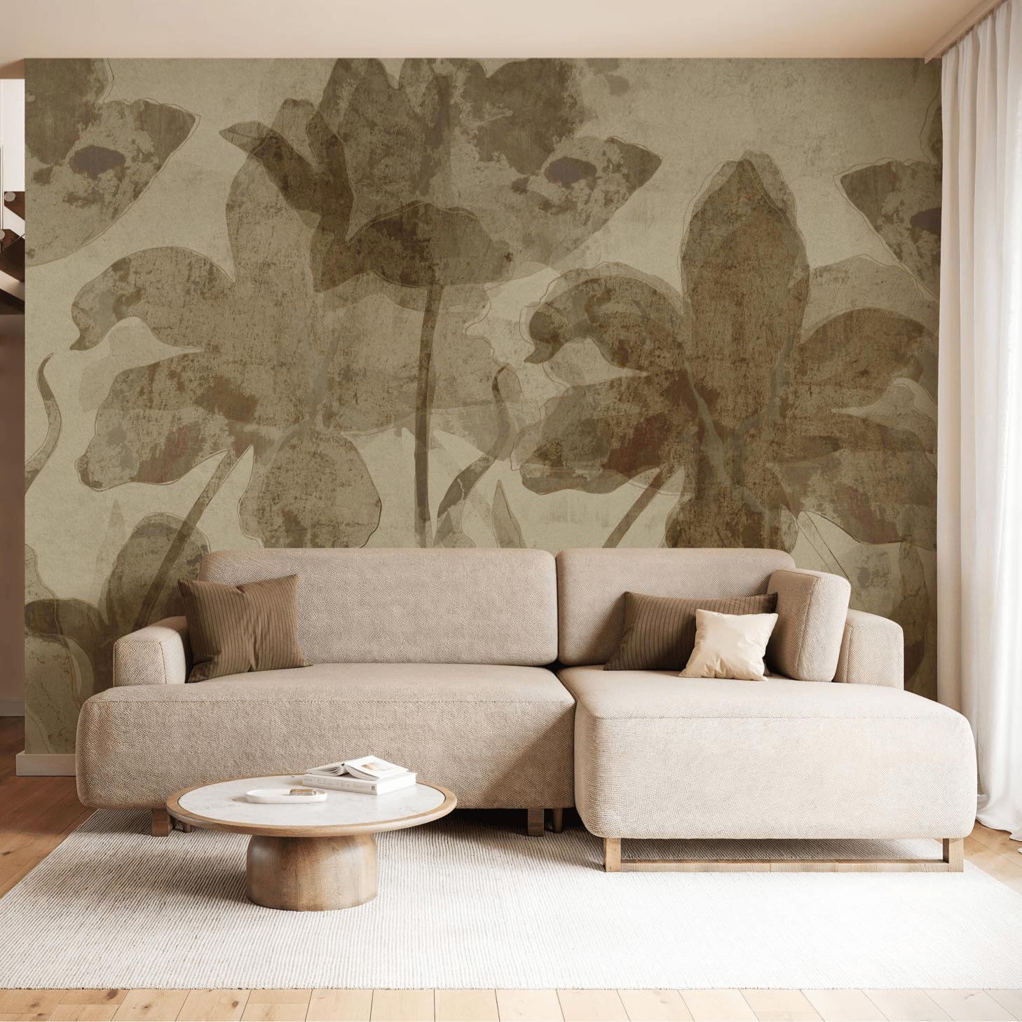 Das abstrakte Blumenmotiv besticht durch sein filigranes Schattenspiel. Die Blüten sind hauchzart auf unterschiedlichen Ebenen mit Bedacht angeordnet und bilden zusammen ein Arrangement auf der Wand.