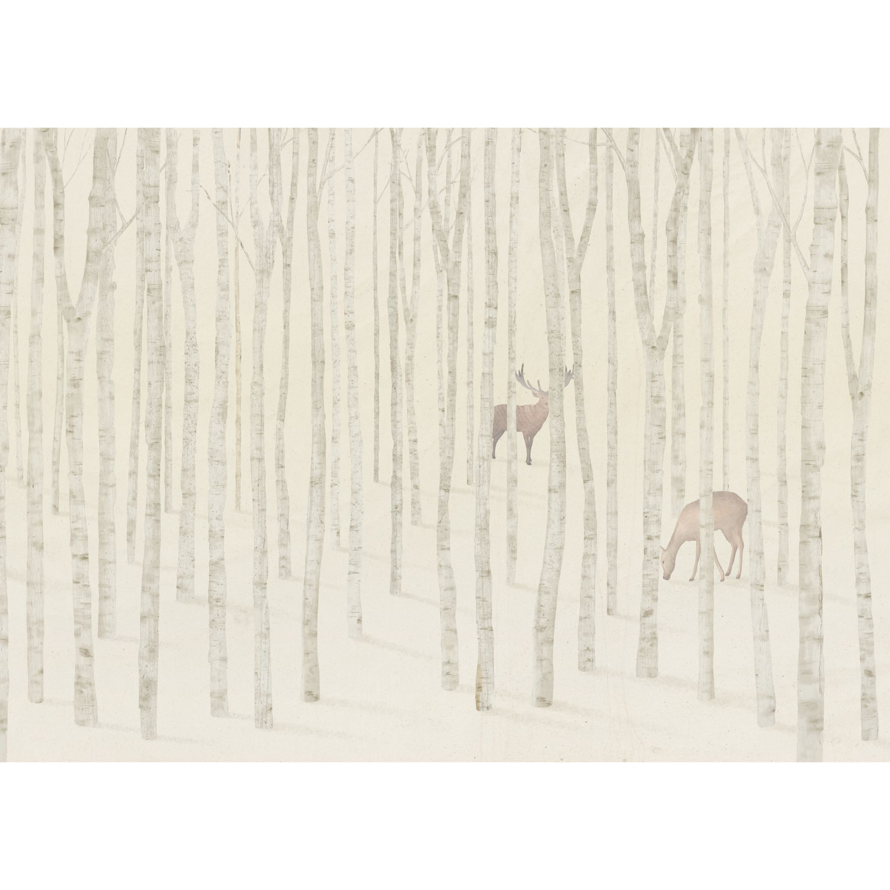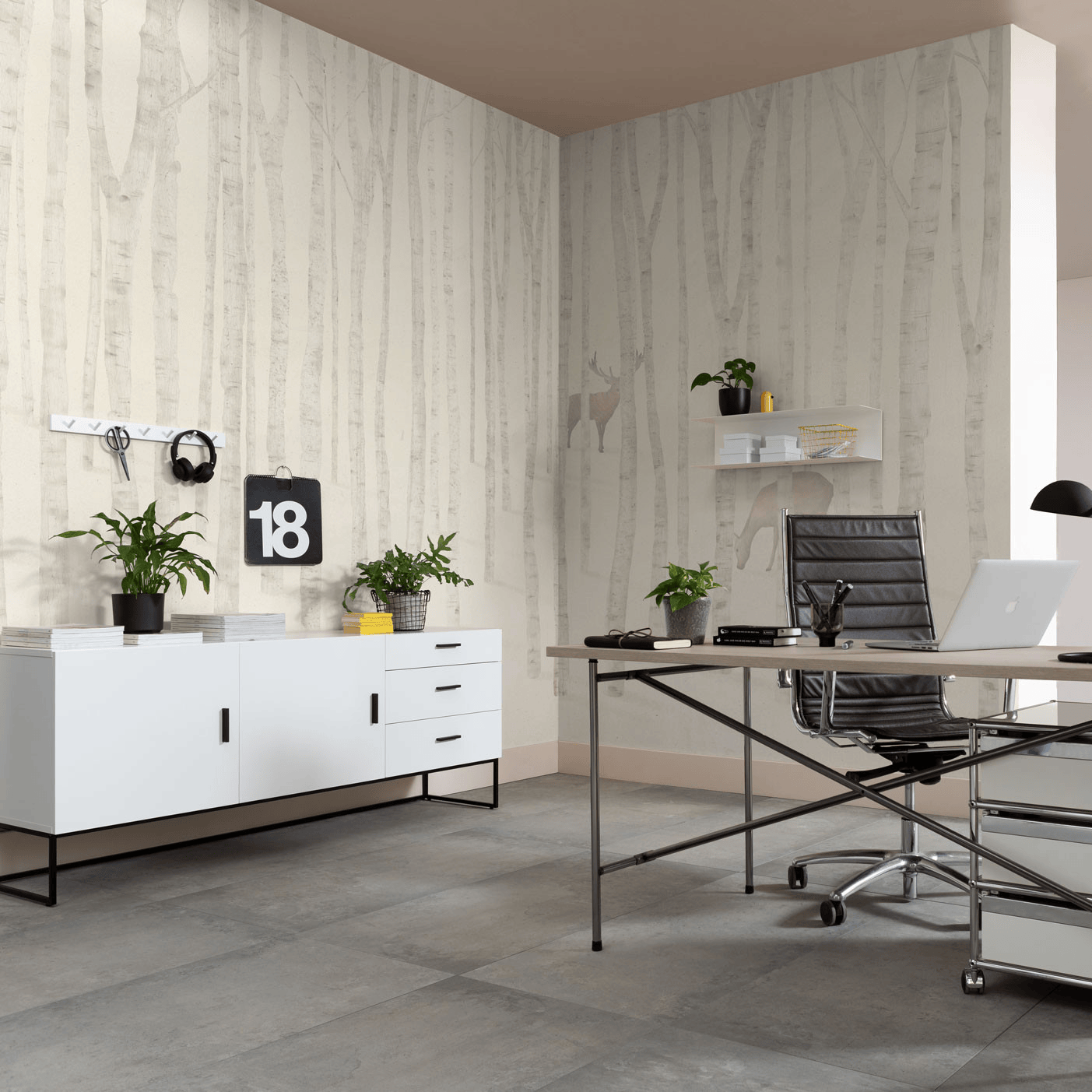 Das Motiv vereint die Liebe zur Natur mit modernem Wohnstil. Die helle Farbgebung wirkt freundlich und lässt den Raum größer wirken.