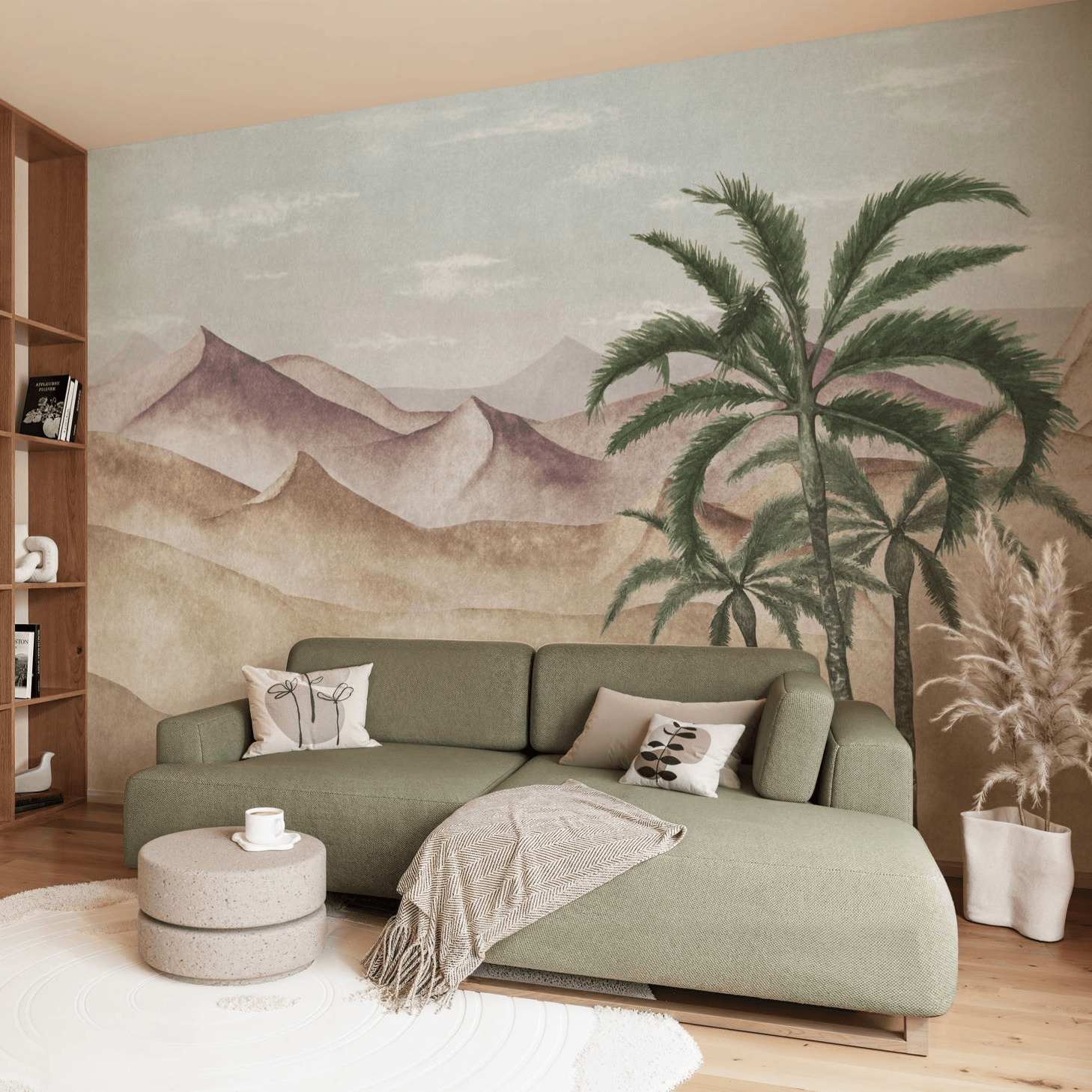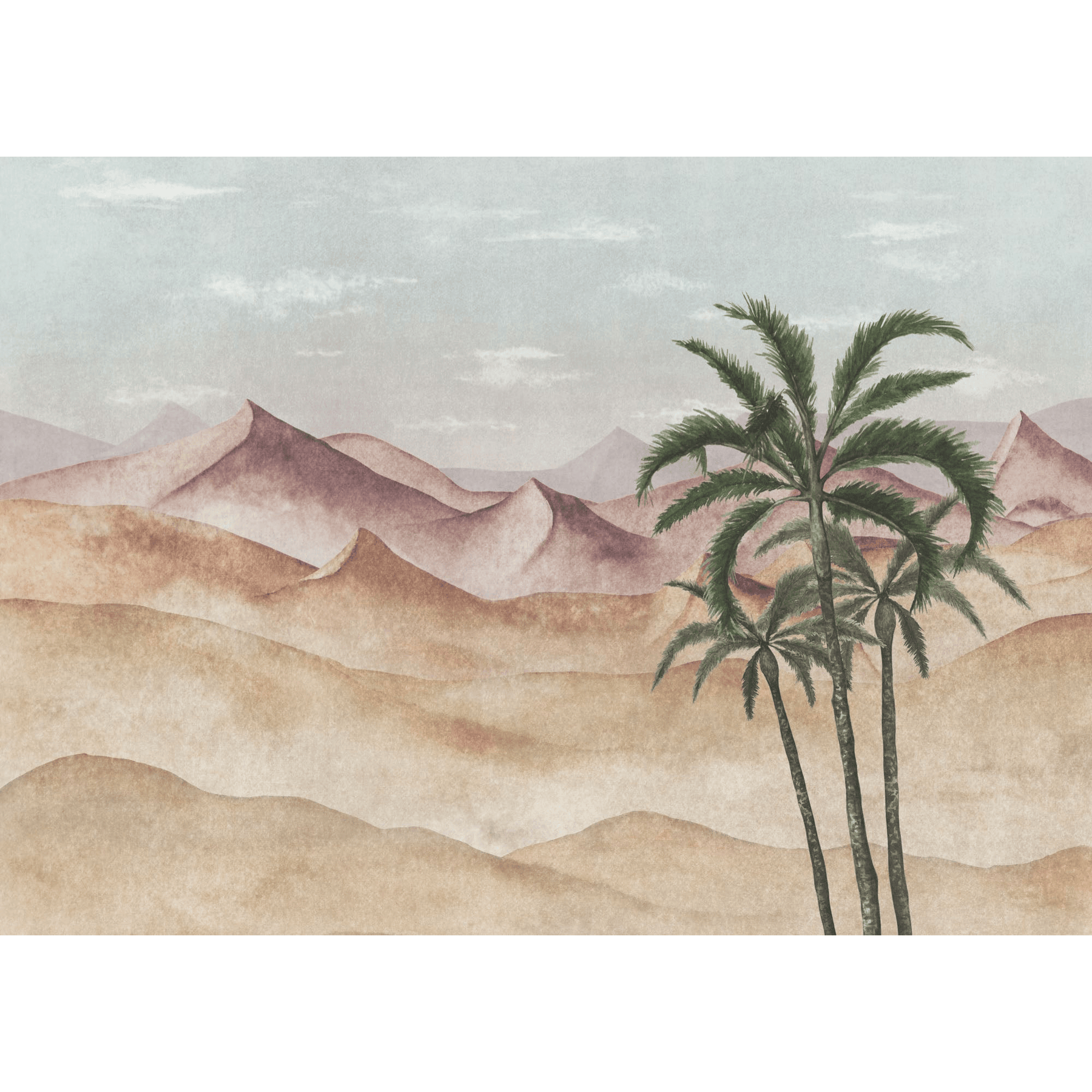 Das Motiv versprüht mediterrane Urlaubsstimmung im eigenen Zuhause. Die warmen Farben in feiner Struktur lassen den Sand der Dünen wahrlich spüren. Ein moderner Akzent setzen die Palmen, rechts auf dem Design.