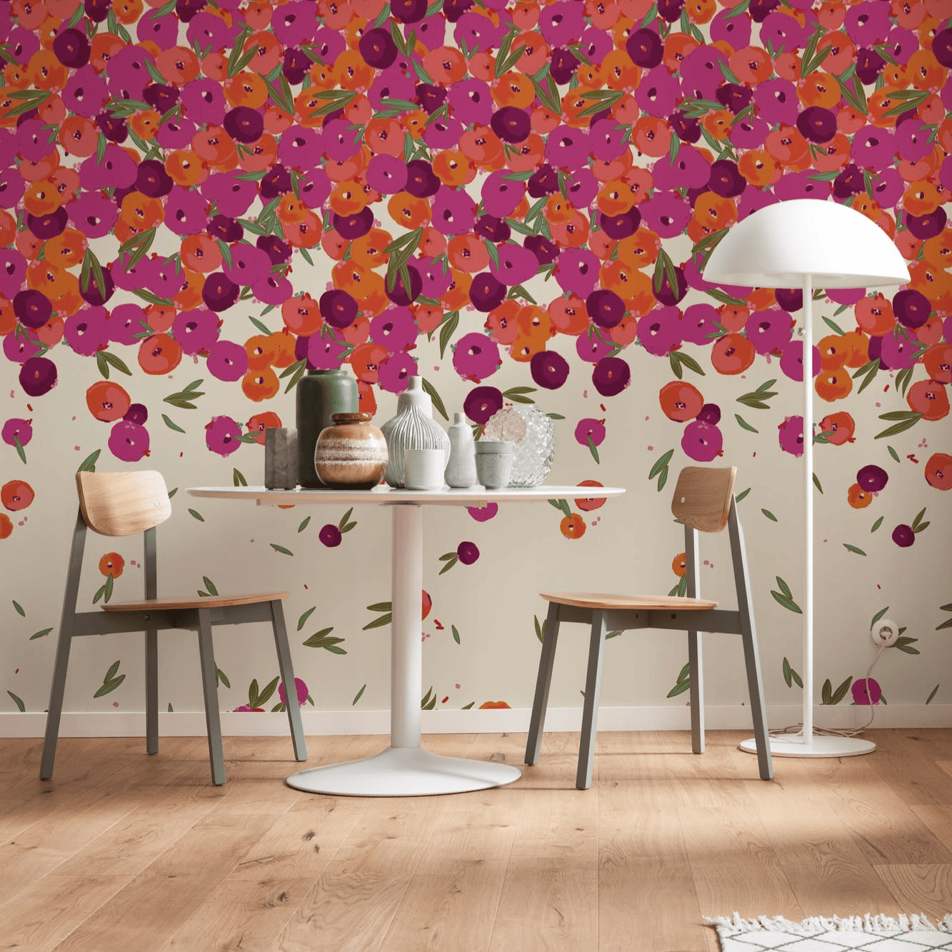 Die Blüten fallen in einem leuchtenden Blumenmeer nach unten. Die im naiven Stil designte Tapete ist in angesagtem Pink-Orange gehalten und sorgt für einen echten Frischekick bei Ihren Bewohner*innen.