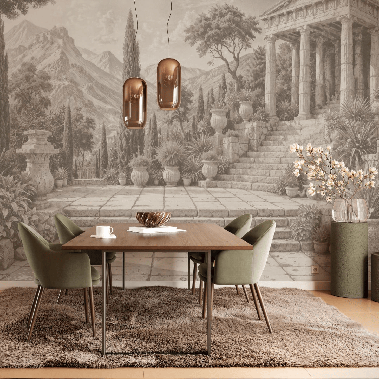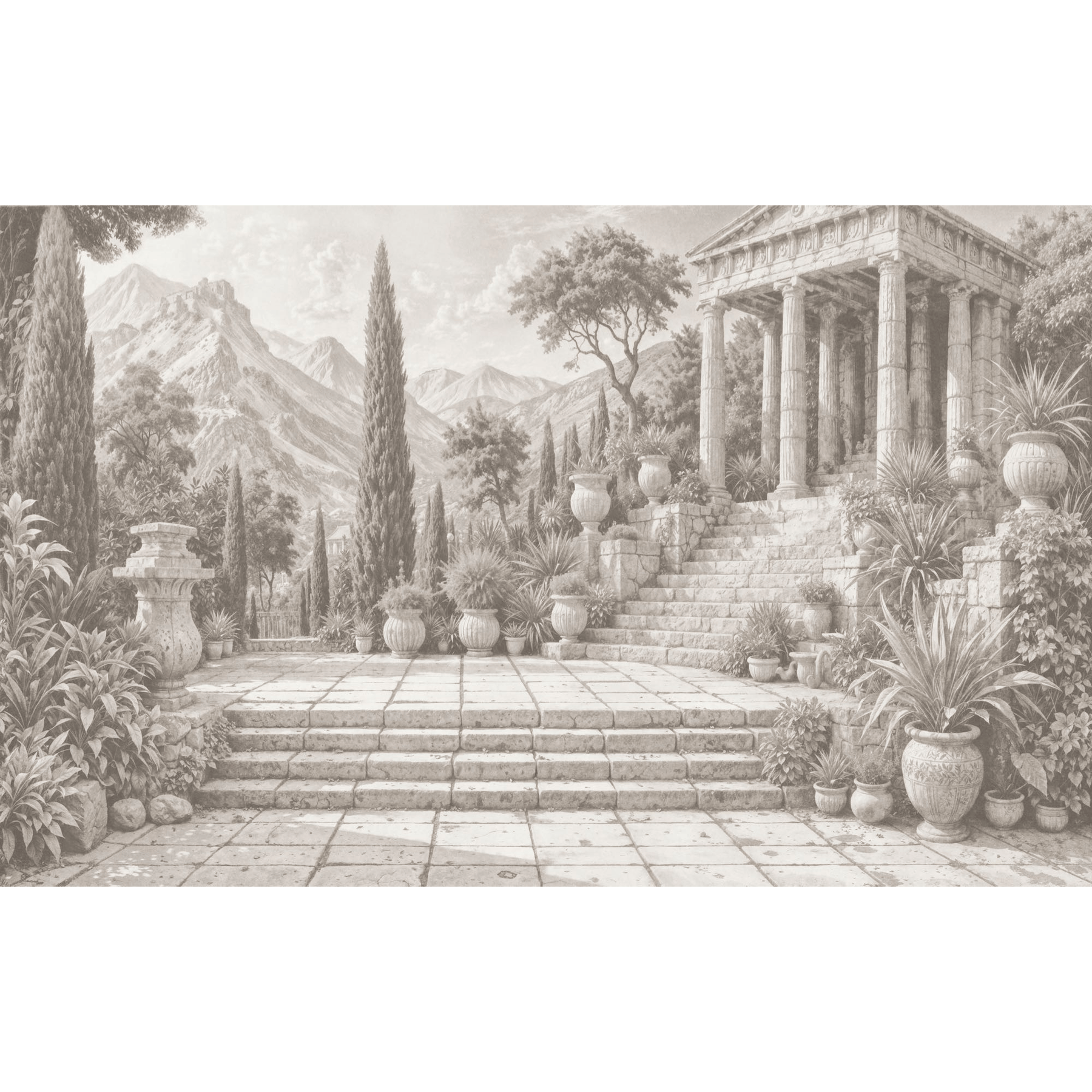 Das nostalgische Motiv in Sepia versetzt die Betrachtenden in eine andere Zeit. Die detailreiche Abbildung lädt das Auge zum verweilen ein. Zu einer modernen Einrichtung verleiht diese Tapete dem Raum eine eine besondere Note.